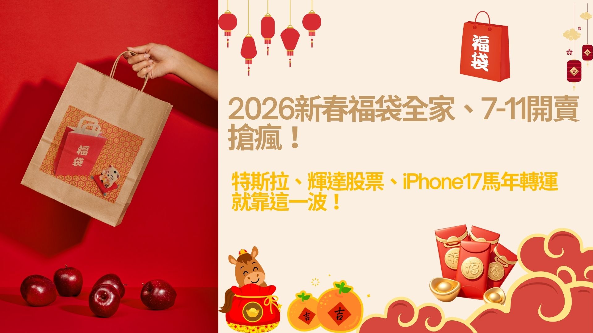 2026新春福袋全家、7-11開賣搶瘋!特斯拉、輝達股票、iPhone17馬年轉運就靠這一波! 2026 年 1 月 15 日2026 年 1 月 14 日 作者: 瓴瓴兒 不提供勞工(勞保)貸款或機車貸款 迎接 2026 馬年,最讓人熱血沸騰的莫過於搶購一份驚喜滿滿的2026開運福 … 閱讀全文